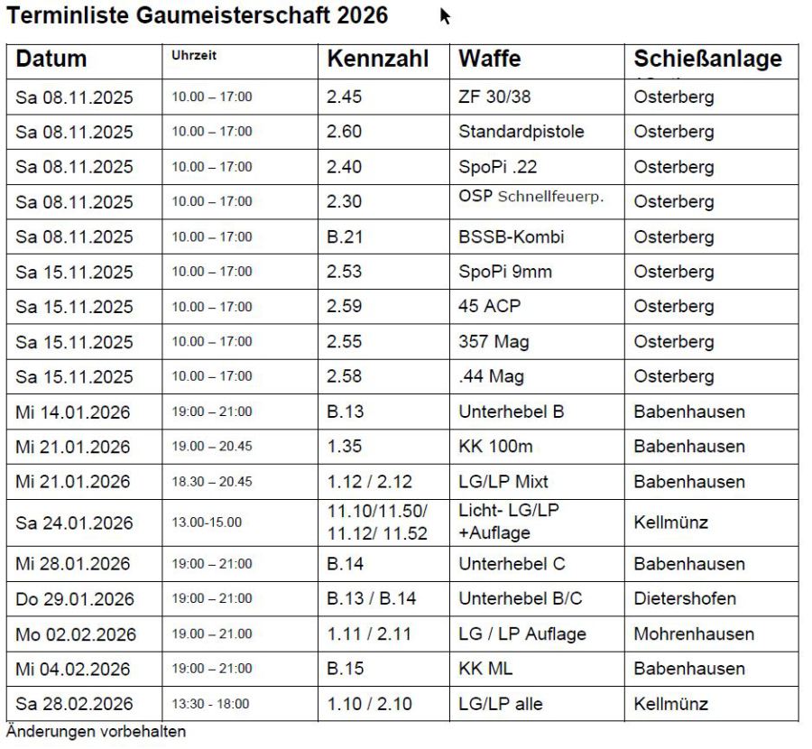 Großkaliberdisziplinen Kurzwaffe bis spätestens Sa. 18.Oktober 2025
